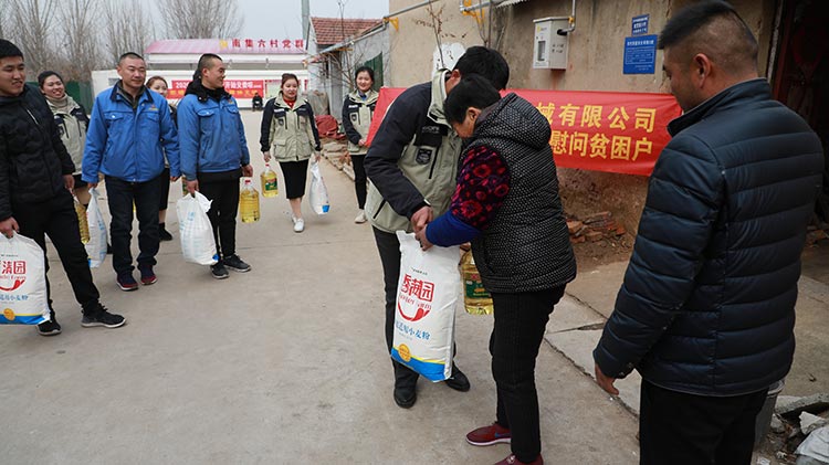 公司準備了大米、食用油等生活物品,在劉總帶領下我們來到了南集六村黨群服務處,和村領導溝通了解了村內貧困戶情況,并一起走訪慰問貧困戶。